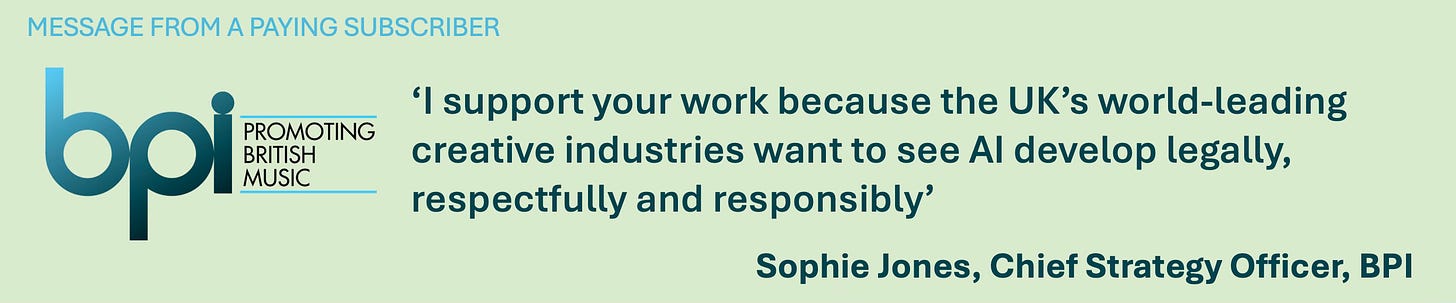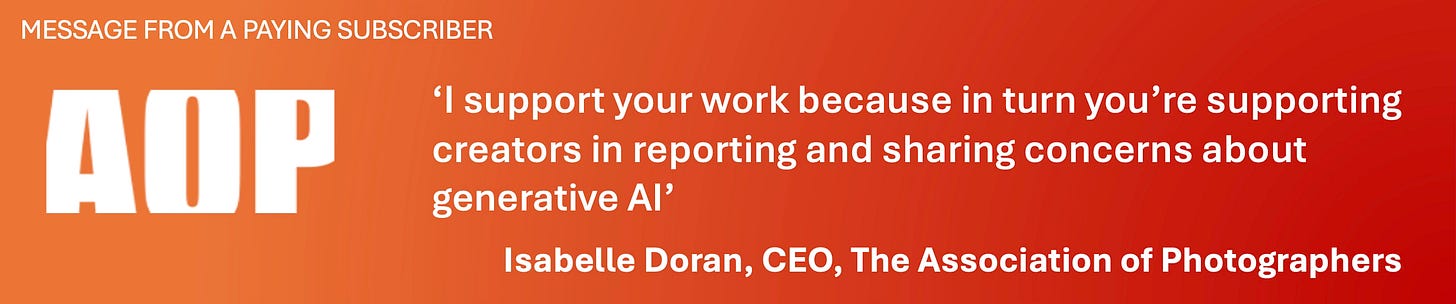 WELCOME TO Charting Gen AI, the global newsletter that keeps you informed on generative AI’s impacts on creators and human-made media, the ethics and behaviour of the AI companies, the future of copyright in the AI era, and the evolving AI policy landscape. Our coverage begins shortly. But first …