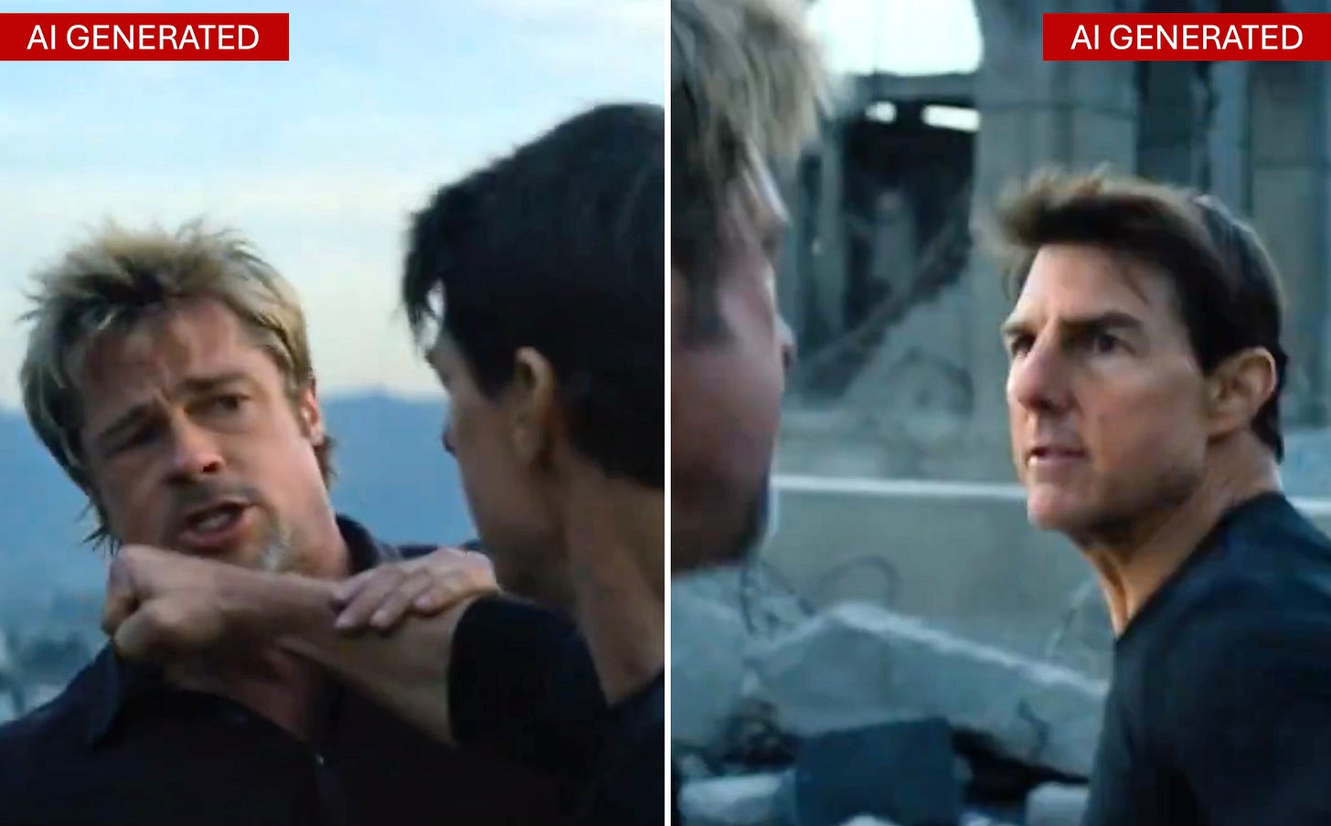 Filmmaker Ruairi Robinson shared a 15-second clip depicting Tom Cruise and Brad Pitt engaging in a fight sequence on a rooftop backed by dramatic orchestral music. Robinson said the hyper-realistic clip was the result of a two-line prompt.