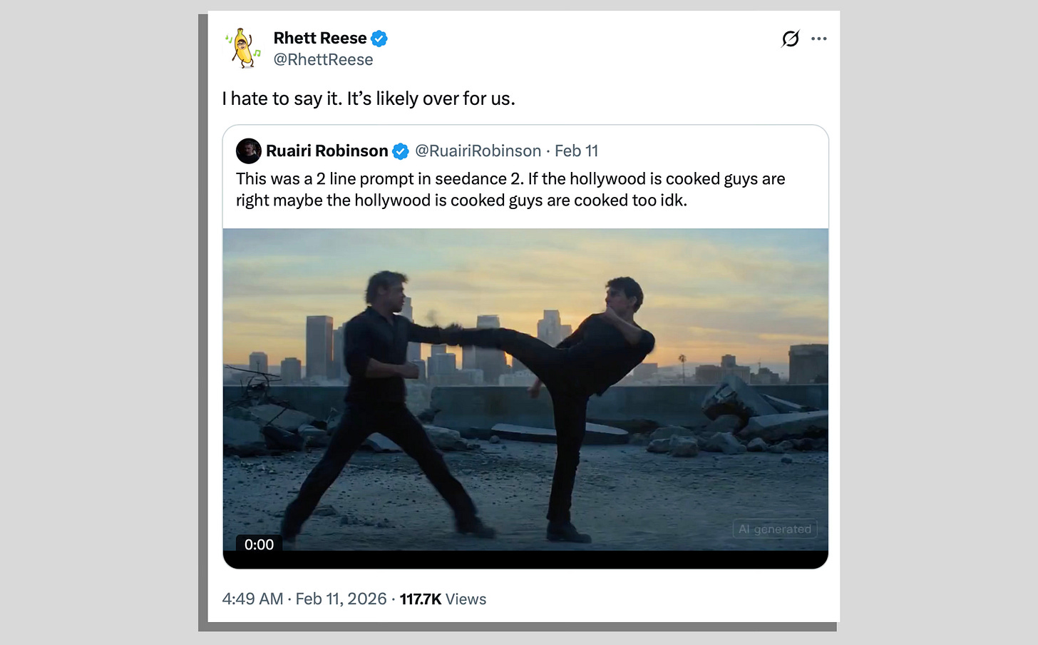 “I hate to say it. It’s likely over for us,” said Reese. “In next to no time, one person is going to be able to sit at a computer and create a movie indistinguishable from what Hollywood now releases. True, if that person is no good, it will suck. But if that person possesses Christopher Nolan’s talent and taste (and someone like that will rapidly come along), it will be tremendous,” he added. Soon other Seedance videos featuring characters from iconic movies began to flood social networks.