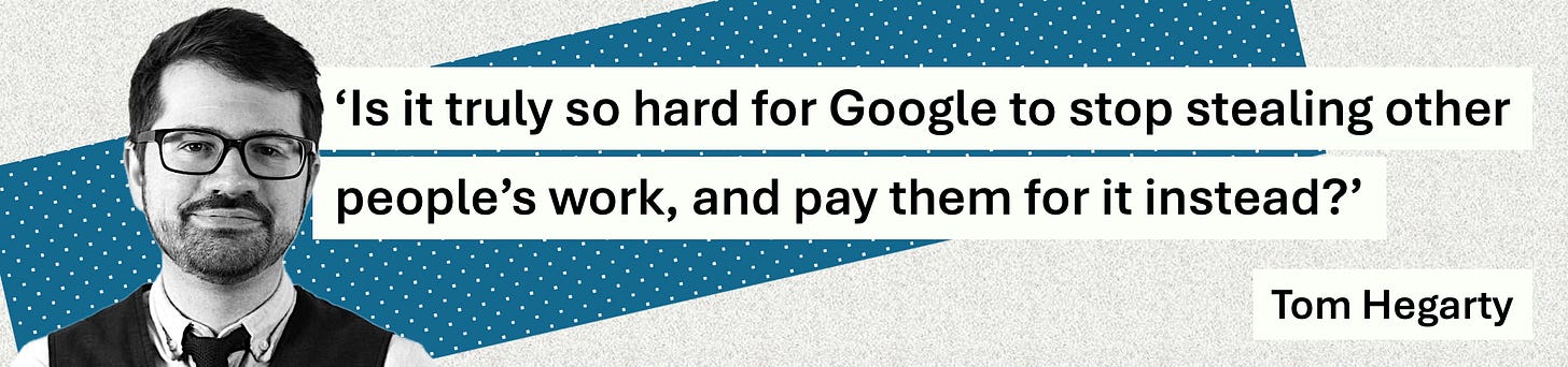 “Naturally, Google has launched an ostentatious PR exercise against being forced to halt its mass global theft of journalism, publicly hemming and hawing about the ‘huge engineering project’ supposedly required. But it is hard to feel much sympathy: Google is one of the world’s wealthiest companies, it has unimaginable resources. Meanwhile, every day seems to bring reports of another newsroom haemorrhaging reporters. Is it truly so hard for Google to stop stealing other people’s work, and pay them for it instead?